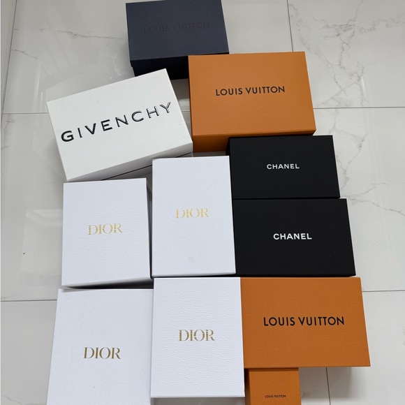 Collection of luxury designer boxes including Louis Vuitton, Chanel, Dior, and Givenchy. Features black, white, and orange colors.