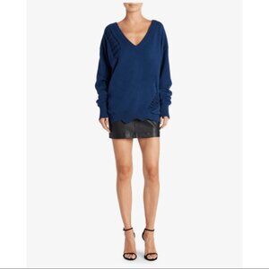 This sweater is super soft and warm! It's made out of 100% lamb's wool. This sweater features a v-neck, long sleeves, ribbed cuffs and hem, and dark blue color. It may look like the bottom is torn, but it is actually woven like that with impressive workmanship and quality.