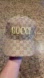 Stylish cap with monogram pattern. Features beige tones and lettering.