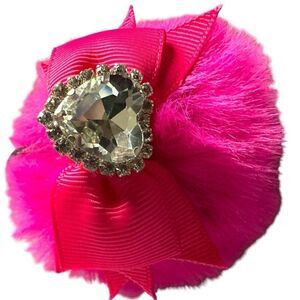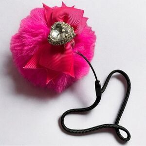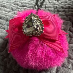Add a touch of glamour to your bag, keys, or phone with this gorgeous charm! It features a soft, vibrant pink faux fur pom-pom, a satin ribbon bow, and a heart-shaped rhinestone embellishment with dazzling crystals. It comes with a practical adjustable black cord for easy attachment.