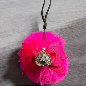 Bright pink fluffy pom pom keychain with a sparkling heart accent. Perfect for adding a pop of color to your accessories.