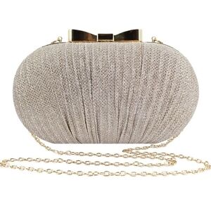 This elegant evening clutch bag features a shimmering glitter design with a stylish shell pattern, perfect for weddings, parties, and special occasions. The gold-tone bow clasp adds a touch of sophistication, while the detachable chain strap offers versatility in carrying styles. With dimensions of 19cm x 12.5cm x 7cm, it provides ample space for your essentials. The interior is lined with a luxurious satin fabric, ensuring your belongings stay secure and stylish.