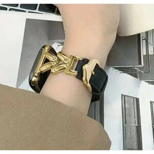Apple Watch band featuring a combination of gold-colored metal and black leather/vinyl. It's perfect for both formal and casual occasions. The band Supports Apple Watch sizes: 42mm, 44mm, 45mm & 49mm
