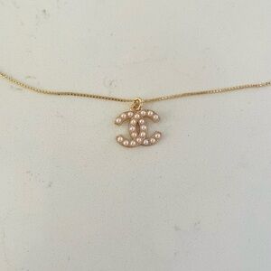 This luxury vintage zipper pull features iconic designer logo in gold accented with small faux pearls. Charm has been added to an 18k gold filled 1mm box chain that measures 16” with 2” extension. Charm measures approximately 20mm, about the size of a nickel.