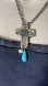 Handcrafted luxury necklace featuring a unique upcycled designer logo monogram bag with a vintage cross, adorned with pearls and turquoise stones. Perfect for adding a touch of elegance and style to any outfit.