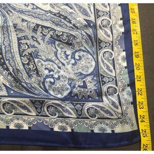 This elegant square scarf features a bold paisley design in varying shades of blue and white, delivering a striking combination of sophistication and style. Measuring 27"x27", the fabric has a smooth, silky feel, providing lightweight comfort and effortless drape. Perfectly versatile, it can be worn as a neck scarf, headwrap, or accessory for a range of outfits. The intricate cowboy wild rage-inspired print adds a unique design flourish. The scarf is new with tags, assuring pristine condition and ready for gifting or adding to your wardrobe. Ideal for all seasons.