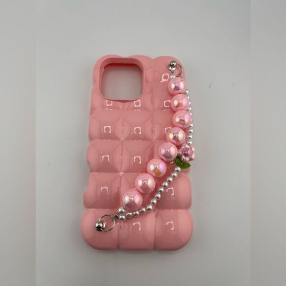 Elevate your phone’s style with this glossy lilac bubble phone case. Featuring a textured, eye-catching bubble design and a whimsical beaded handle with pearl and charm accents, this case combines functionality with playful elegance.