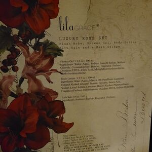 Luxury plush velour robe set by lilaGrace. Includes a plush soft robe, 100% polyester, one size, shower gel, body lotion, bath salt, and a mesh sponge. Makes an excellent gift