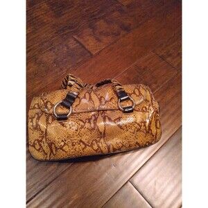 Keywords: snake print bag, python pattern purse, faux leather handbag, brown shoulder bag, animal print bag, metal hardware purse, structured handbag, fashion accessories, statement bag, reptile print