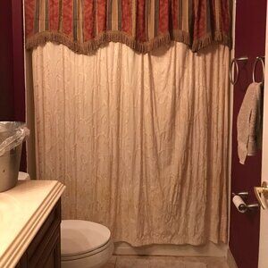 Elevate your bathroom with this elegant two-piece set, featuring a richly patterned striped valance with fringe trim and a cream embroidered shower curtain. The combination creates a high-end, classic look that works beautifully in traditional or transitional spaces.