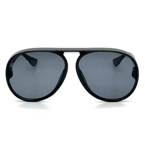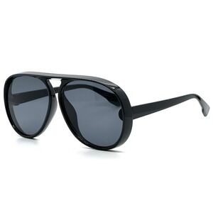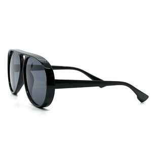 Statement sunglasses with a bold, modern design. These sunglasses feature a classic aviator shape with a contemporary twist, showcasing a thick, glossy black frame and dark, tinted lenses. The double bridge detail adds a touch of retro flair, while the rounded edges soften the overall look. Perfect for adding an edgy touch to your everyday style, these sunglasses are ideal for sunny days at the beach, outdoor events, or simply making a fashion statement in the city.