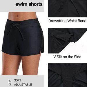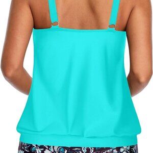 Features: This cheerful tankini set features a flowy, blouson-style tank top with a relaxed fit that beautifully conceals the tummy. Built-in bra and adjustable shoulder straps mean support and comfort are assured. The high-waisted black boyshorts offer good tummy control and a cute slit-leg detail for a flattering fit. Made of quick-drying, stretchy, durable material, perfect for active beach days, swimming, or just lounging poolside.