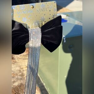 Make a glamorous statement with this Sunday State black velvet bow hair accessory adorned with cascading crystal rhinestone tassels. The soft, elegant velvet contrasts beautifully with the shimmering rhinestones, creating a luxurious and bold look. Perfect for special events, parties, or adding sparkle to your everyday style.