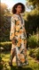 Elegant kaftan with vibrant yellow floral design on a white background. Perfect for a stylish and comfortable look.