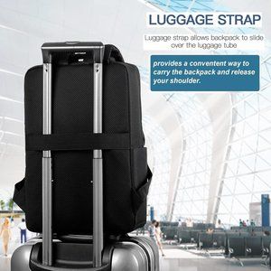 This slim laptop backpack for men is thin,compact, size: 14 L*7.5 W*19 H inch,weighs only 550g, The luggage strap allows this work backpack fits on luggage/suitcase which frees your hands.This work backpack for men women very suitable for short-term travel.