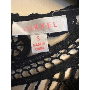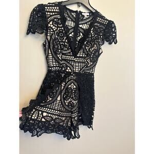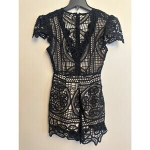 Chic Luxxel black crochet lace romper in size Small. Deep V neckline, short sleeves, and back zipper closure. Fully lined with a flattering silhouette.