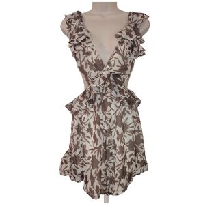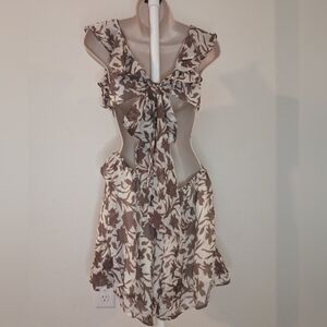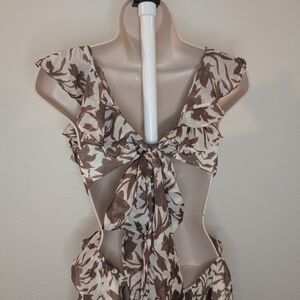 This stunning Luxxel romper features a captivating plunge neckline and flutter tiered cap sleeves, perfect for a wedding guest or cocktail event. The ruffled and pleated design in a rich brown hue adds a touch of elegance, while the tie detail accentuates the waist for a flattering silhouette. The backless style enhances its allure, making it an ideal choice for a night out. Brand new with tags perfect condition.