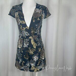 This eye-catching piece features intricate floral sequin detailing that adds a touch of glamour and sparkle. The deep V-neckline enhances its bold, flirty appeal, while the romper's silhouette provides a chic and comfortable fit. Perfect for special occasions, nights out, or when you simply want to stand out, this romper pairs beautifully with heels and minimal accessories for an unforgettable look.