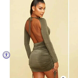 Gorgeous color and style. Side ruching can be adjusted depending on how long you want it to be. Super stretchy. Olive dress in photos is the same dress just in a different color. Measures 35 inches from shoulder to hem.