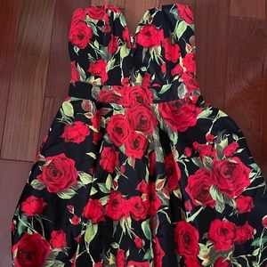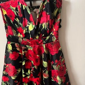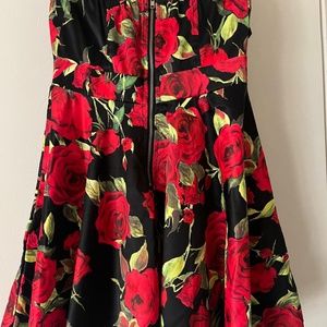 Beautiful rose floral print mini dress, zipper in back. Fits on upper waist then fans out perfectly below waist, ending about 2 inches above knees. Perfect for special occasions such as going out with friends, social events and even homecoming.