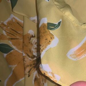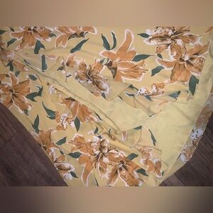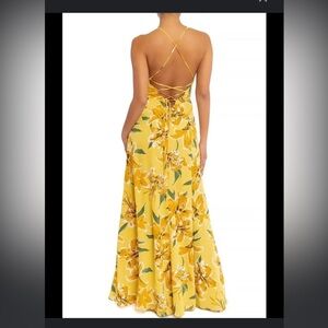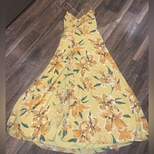 Vibrant yellow dress with floral print. Asymmetrical hem. Spaghetti straps. Perfect for summer events.