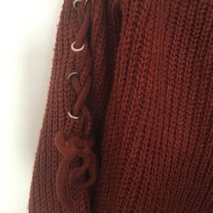 Luxxel sweater, size large. This rust colored sweater is long sleeved. The sweater has a lace detail on flare sleeves. The sweater can also be worn off the shoulder. There are no holes, snags or stains.