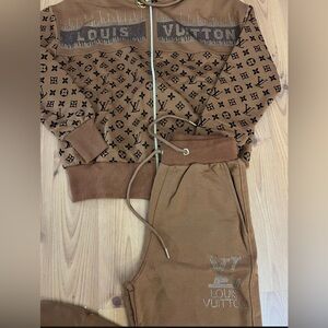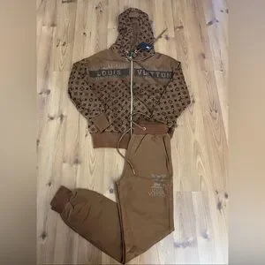 Elegant tracksuit with signature monogram design. Includes zip-up hoodie and drawstring pants.