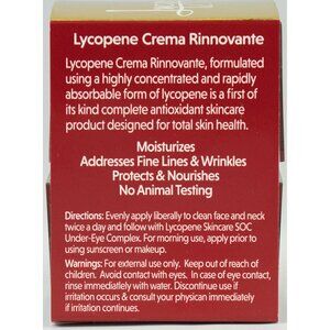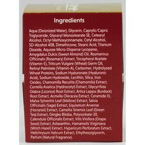 This cream contains a bright red carotenoid found in tomatoes and other red fruit, berries and vegetables, such as a red carrot, watermelon, rose hip, grapefruit, papaya, strawberries and cherries. The cream also contains 19 natural botanicals to visibly reduce wrinkles, nurtures and protects the skin. The cream contains anti-aging astaxanthin.