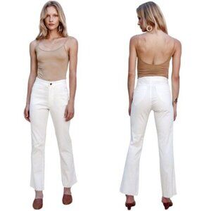 - Mid-rise hits right below the belly button, tight through the thigh with a cropped kick-flare bottom!
