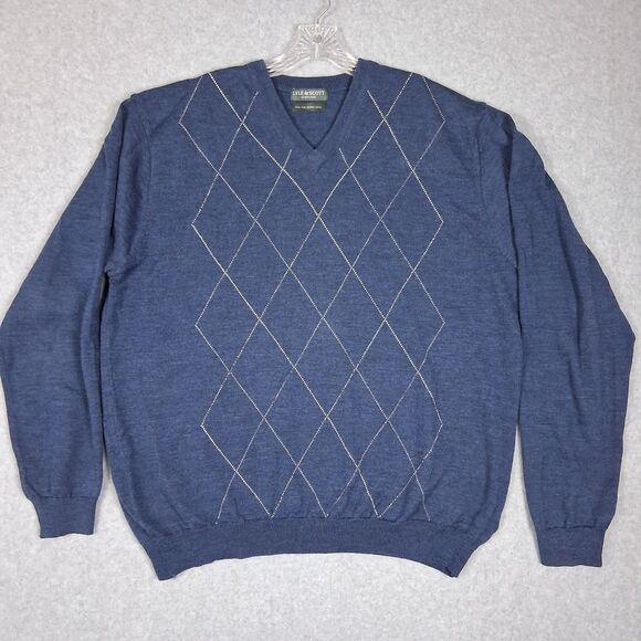 Lyle and Scott Mens 100% Merino Wool Sweater XL Blue Argyle Classic Golf Preppy