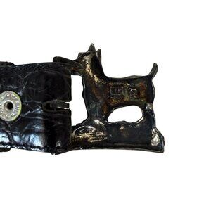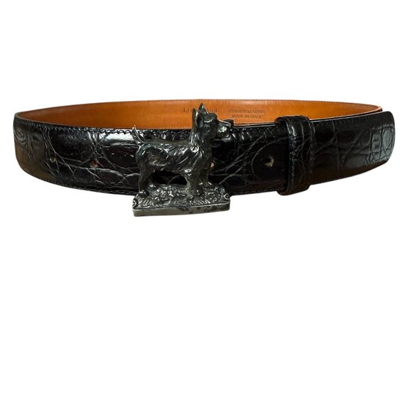 Men's Lyn Gaylord New York black genuine leather adjustable waist belt with a dog buckle in gun metal, size small. 34" Length 1" Width. Made in Italy. Like New! Smoke free pet free home. Quick shipper! Please feel free to ask me questions.