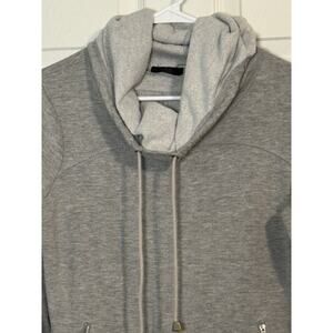 Small flaw on back, small stain shown in pictures. The Lyn Gray Pullover Sweatshirt is a comfortable and stylish activewear option for women. Made from a blend of cotton and polyester, this medium size sweatshirt features a classic pullover style with a front zip pocket design. The gray color and polyester lining make it versatile for various occasions, while the pockets add a practical touch. Perfect for casual wear or as a layer for outdoor activities, this sweatshirt is a must-have for any wardrobe.