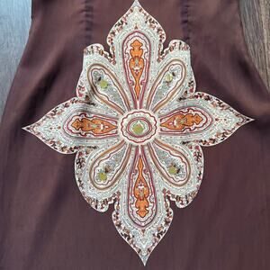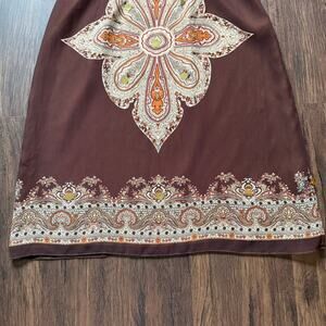Elegant Lyndia by Lyndia Pescanik chiffon sheath dress featuring a rich chocolate-brown body with ornate paisley and floral placement print. Gold satin lining with sequin-tipped straps adds a touch of sparkle reminiscent of early-2000s “Rachel Green” Friends-style party looks. Fully lined with slight stretch for comfort (96% polyester / 4% spandex).
