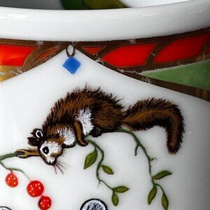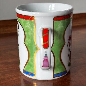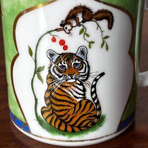 Beautiful Lynn Chase Designs “Tiger Raj" double-sided mug decorated with 24 karat gold. This vintage coffee cup is white and features a multicolor design, including a decorated handle and an illustration of a bird on the inside.