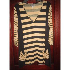 This listing is for a lovely size Large popover tunic length lagenlook style stretch knit top from Lynn Ritchie Silver. The top is done in a soft rayon and spandex knit fabric in a deep beige or tan and black striped pattern, with sine solid black around the sides.