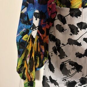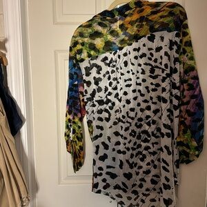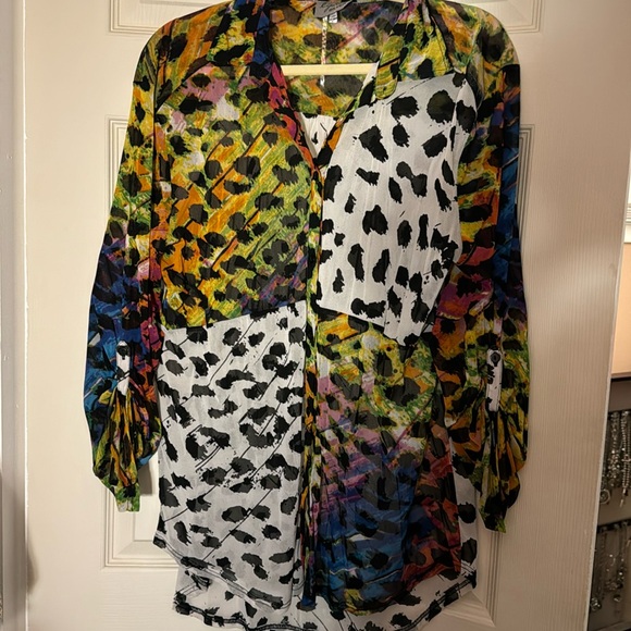 Vibrant colors mixed with black and white spots..this is a long blouse with sleeve’s that can be made a bit longer when button undone..This shirt looks great with leggings…very light weight and semi sheer…