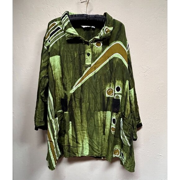 Lynz Women's Popover Geo Print Tunic Top Size Large Green Collared Long Sleeve