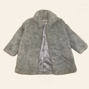 Lyre Bird Vintage Faux Fur Coat | Gray Silver Plush Swing Jacket, Hook Closures