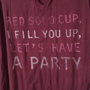 Lyric Culture burgandy short sleeved t-shirt. The V-neck has a criss cross of fabric for more style. Emblazoned on the front with the immortal lyric Red Solo Cup, I fill you up, Let's have a party! RIP Toby Keith EUC