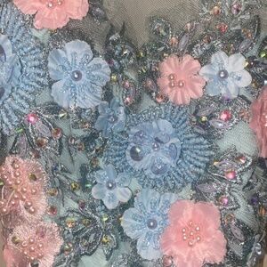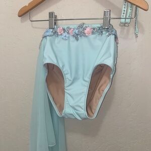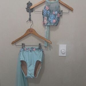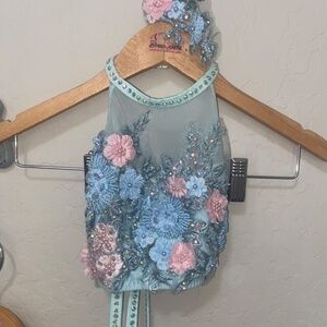 Beautiful light blue 3 piece costume for sale! Halter style top with bling 3 strap back detail. Front of top has gorgeous floral detail with bead and bling. Bottom matches too with detail and long tulle material that flows beautifully. Comes with matching hair piece. This is a large child size.