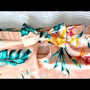 Lysa high waisted pink floral tropical pattern bikini swim bottoms. Featuring a flattering front PowerMesh panel and elastic waistband. Embellished with a back peek-a-boo bow. Fully lined. UPF 50+