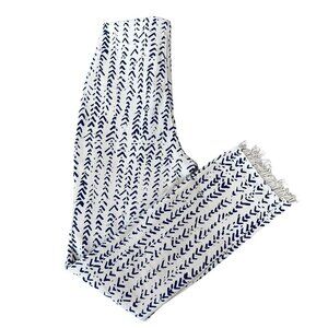 Britt Ikat Ankle Pants. They are white with a blue geometric print and have a fringed hem. Lysse is known for comfortable and flattering pants, including leggings and jeans, featuring a signature 4-way stretch and a hidden waistband. These pants are described as having a straight leg and a tummy-smoothing design. These pants, with their flowing print and fringe detail, evoke a sense of breezy sophistication. Ideal for casual outings or relaxed evenings, they combine comfort and style effortlessly. The elastic waistband ensures a secure fit, while the unique design celebrates individuality with every step.