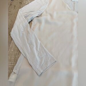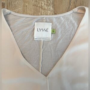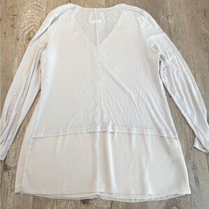 Lysse Size Medium light beige V-neck Blouse. Chiffon front w Jersey knit sleeves and back.