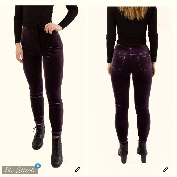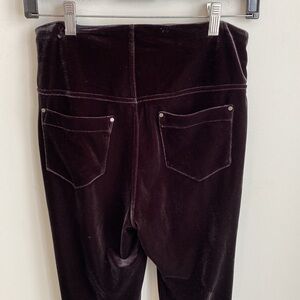 Luxe velvet leggings in a dark brown color. Inner tummy smoothing panel. High rise. Pull on style. Rear patch pockets.