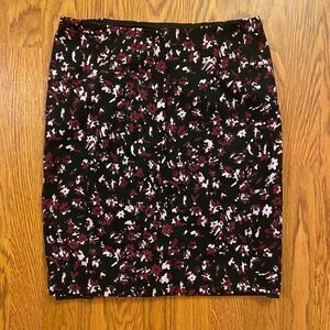 Black pull on pencil skirt with abstract floral pattern in dark purple and lavender. Small slit in back. Lined. Stitch Fix Exclusive. Great for work or church.