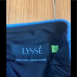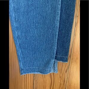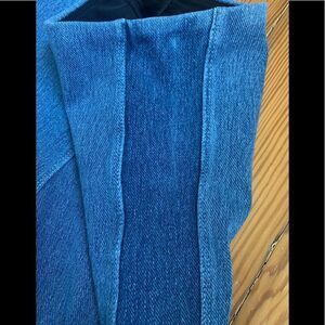 Lightly worn. Flattering fit. Darker blue on side of each leg (pictured). Uneven hem. Size S