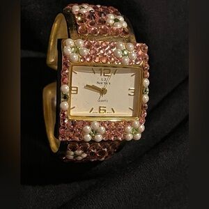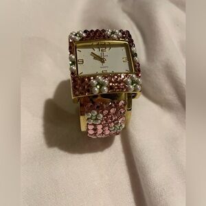 You really have to see this watch to see the beautiful Aurora Borealis crystals. The video shows a little bit. But the pictures really don’t show the bling. It is absolutely beautiful pink rhinestones. With white pearl flowers.