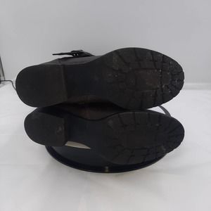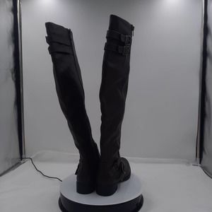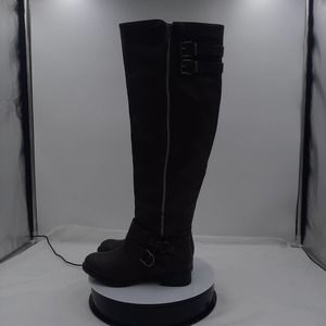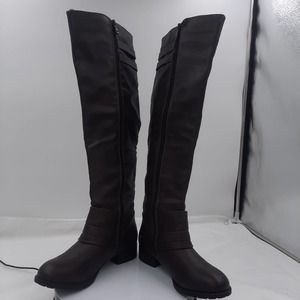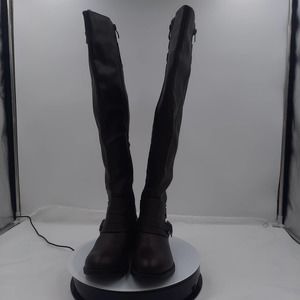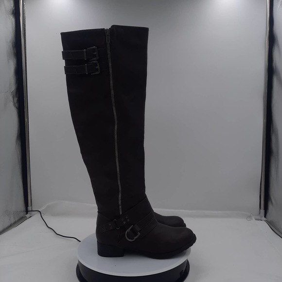 Just Fab Elodie Brown Faux Leather strappy Knee high boots with inside zipper. Outside decorative zipper. Preowned EUC, all boots have been cleaned, sanitized and or polished.