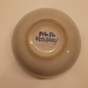 The blue, pink and green design is painted on by hand, this is an original piece from M. A. Hadley Pottery and is an art pottery production style that uses traditional pottery techniques to create stunning pieces making each piece unique. Some different size in designs, motifs and imperfections can be expected as these pieces are individually made, painted and finished at the factory in Louisville, KY. Measured approx.: Diameter: 5 1/2 inch., Height 2 inch. Pattern Chicken. Please see photos for specifics of the design and to evaluate the condition of any imperfections or signs of wear. Stored in a clean, Smoke Free Environment.