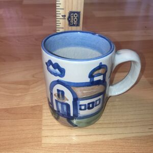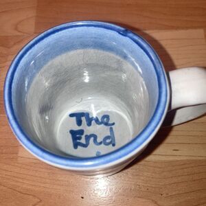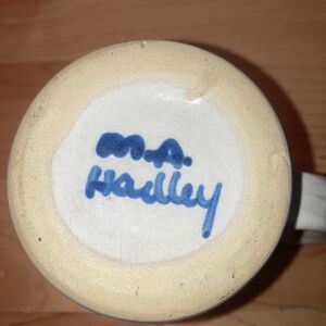 The M A Hadley Signed Hand Painted Farm Barn Mug is a vintage 10oz ceramic mug featuring a unique blue color with a hand-painted design. This original piece of pottery is handmade in the United States, with "The End" written in the bottom, adding a touch of whimsy to the overall aesthetic. The mug is signed by the artist, M A Hadley, and has a diameter of 3 inches and a height of 4 inches, making it a charming addition to any collection or for use on all occasions.